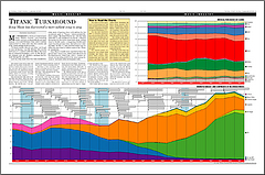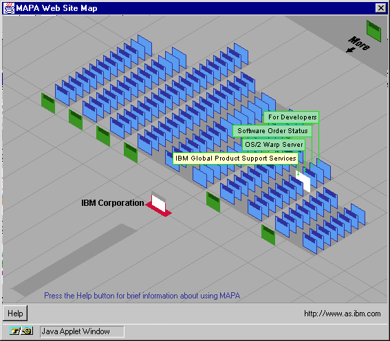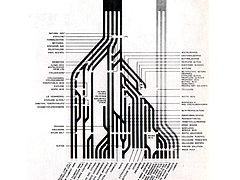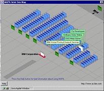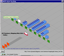 932 | 2005 computer graphics by (unknown) yFiles is an extensive Java class library that provides algorithms and components enabling the analysis, visualization, and the automatic layout of graphs, diagrams, and networks. The yFiles library offers the user many advantages, one of which is its ability to create, edit, and visualize large graphs with hundreds and thousands of elements. Here shown is a huge site map laid out and routed organically. For a large version of this image click here. |