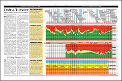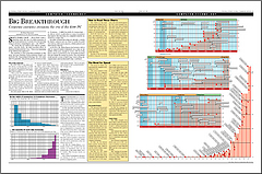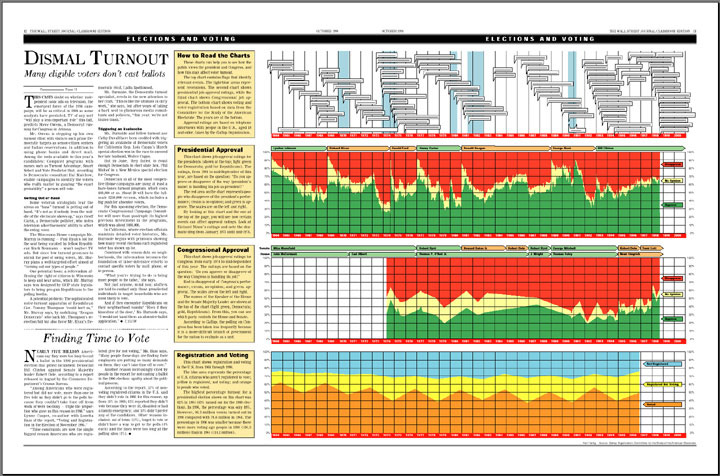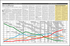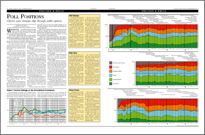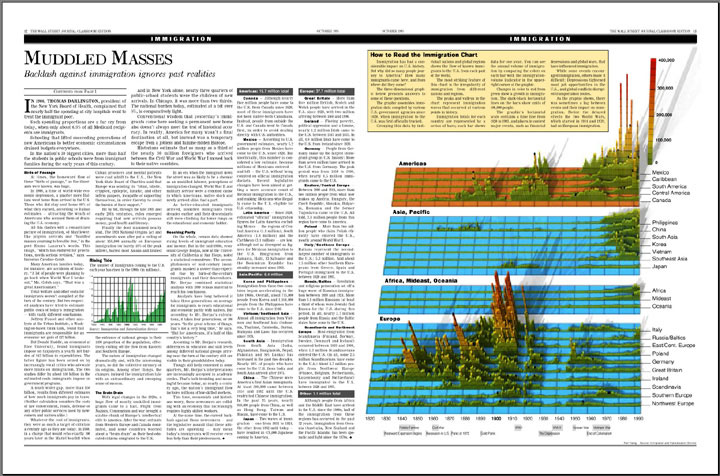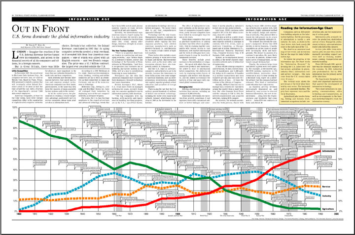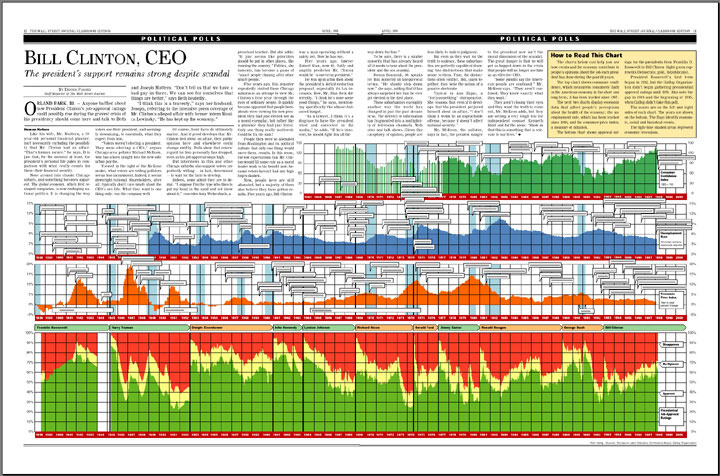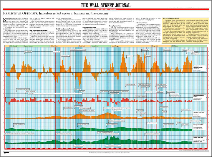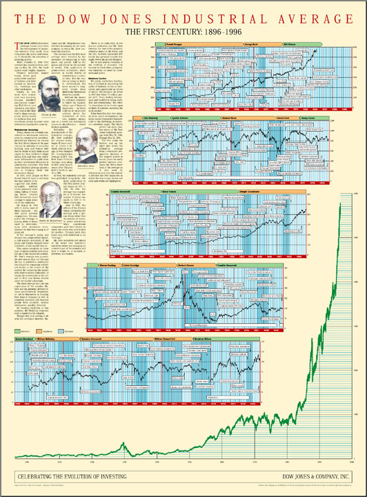 595 | computer graphics by Karl Hartig The First Century: 1896-1996 - 100 years of the daily Dow Jones Industrial Average as one 100 year chart and as five 20 year charts with historical flags. |