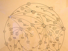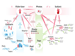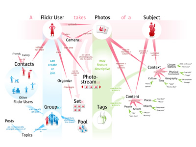 1048 | 2005 computer graphics by Bryce Glass Bryce Glass has developed a series of delightful Flickr user model diagrams where one can easily understand the Flickr ecosystem and the full potential of the popular photo-sharing service. In October 24, 2005, Bryce posted this original diagram in his blog (Soldier Ant), which ended up becoming the first of a series of iterations. The latest version (v0.3) has several new elements, such as comments, rss feeds and blogs, but I still prefer the intact purity and simplicity of the original version (shown here). On his post on October 24, Bryce explains: "I've been doing some concept diagramming for work lately, and I've found myself enjoying it immensely. (...) However, since it's for work I can't share much of it. I did post some sanitized versions, with all the object-names obsfucated, but that just didn't seem wholly satisfying. So over the weekend I invested some time in a diagram that I can share with the internets: a simple Flickr user model (regrettably incomplete -- but I realized that if I tried to include the whole Flickr-verse that this diagram would go beyond labor of love and straight into excercise in folly)". To see Bryce's latest version of the diagram click here. |