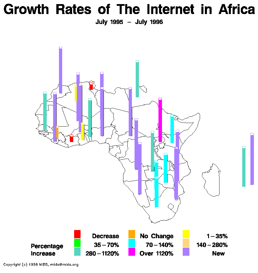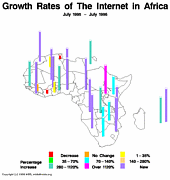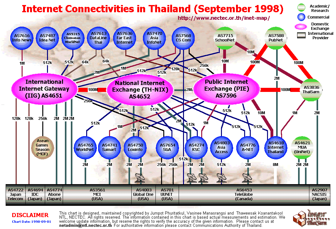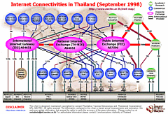 286 | 1998 computer graphics by Jumpot Phuritatkul and Thaweesak Koanantakool, NECTEC, Thailand Diagrammatic map showing Thailand's Internet Connectivity in September 1998 (another is from 1997). |